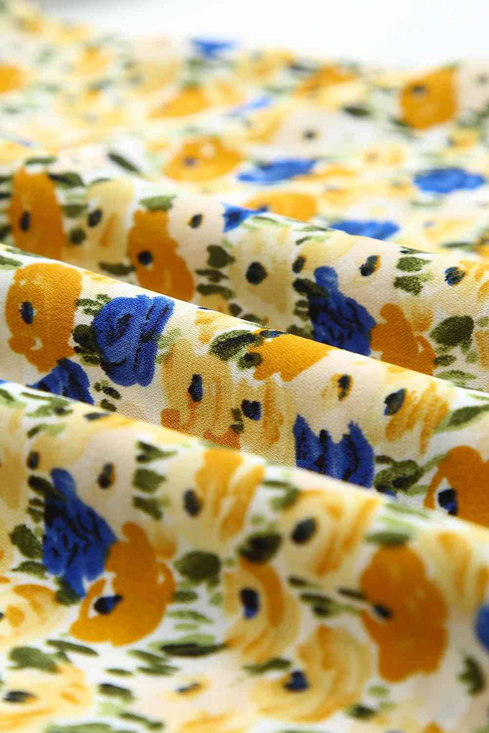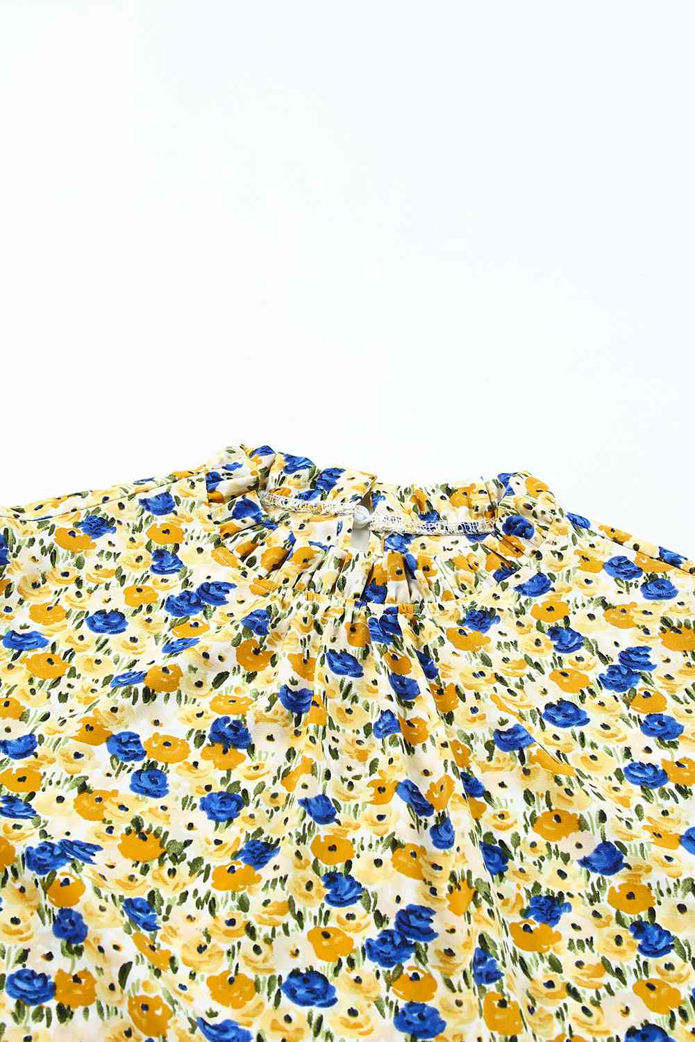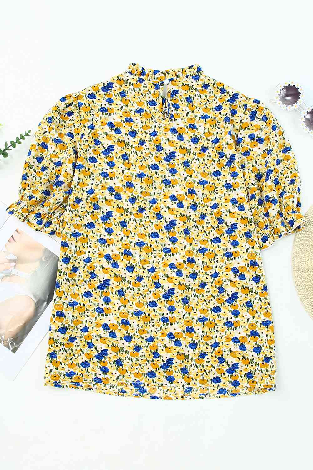 Boho Floral Ruffle Short Sleeve Frill Mock Neck Blouse