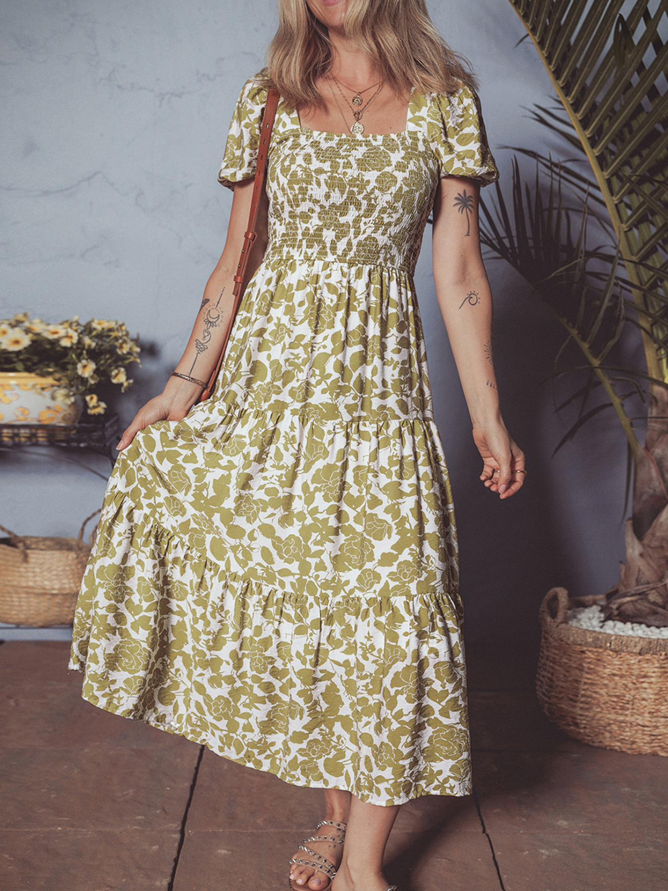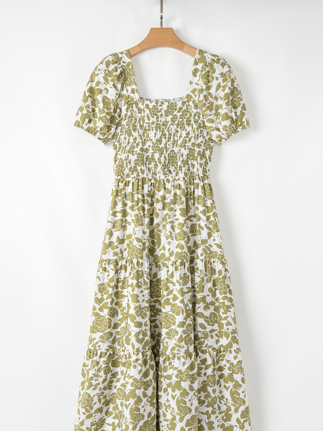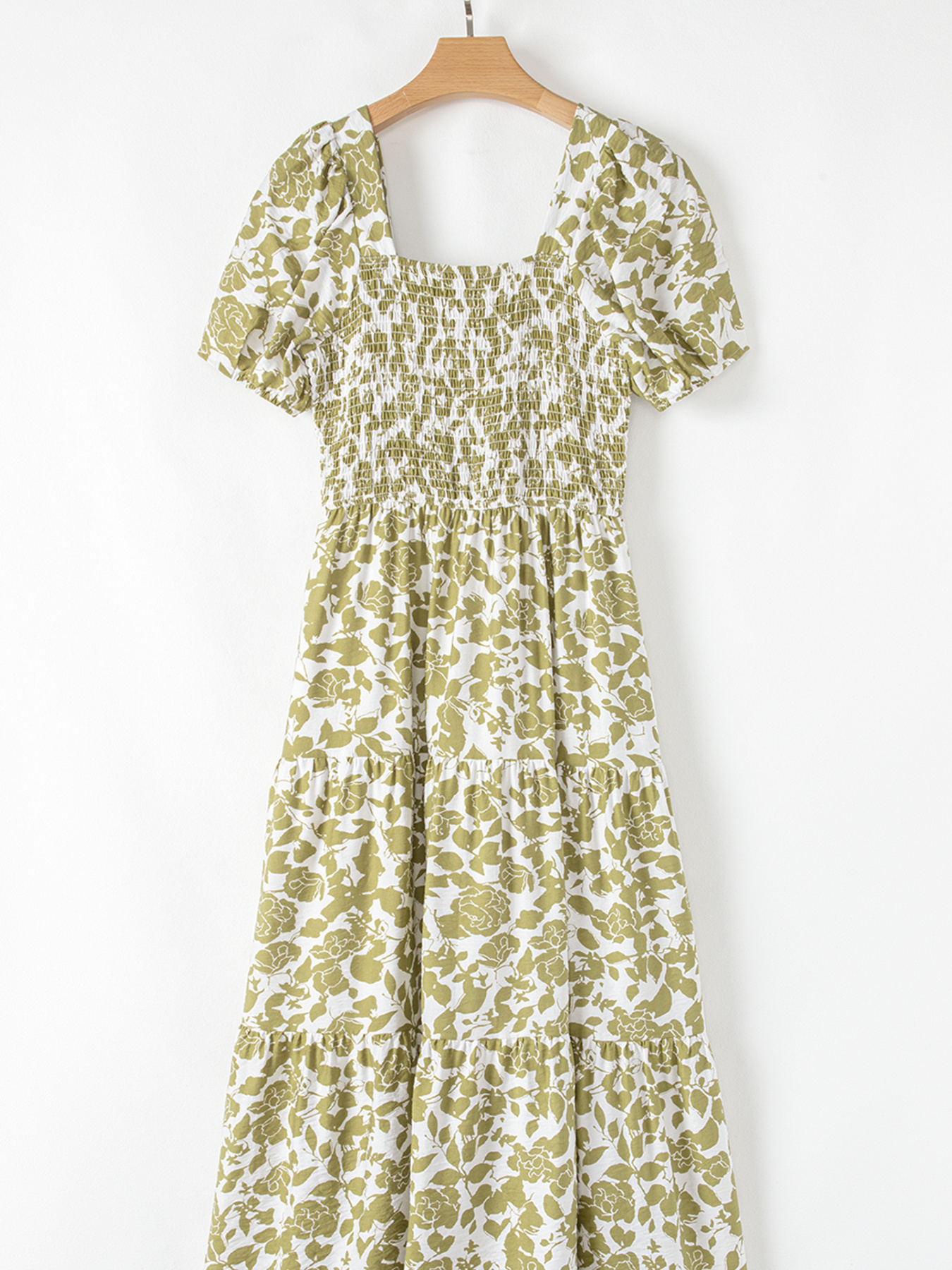 Boho Floral Square Neck Smocked Bust Puff Sleeve Tiered Dress