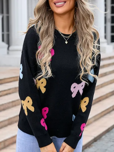 Bow Graphic Round Neck Long Sleeve Sweater