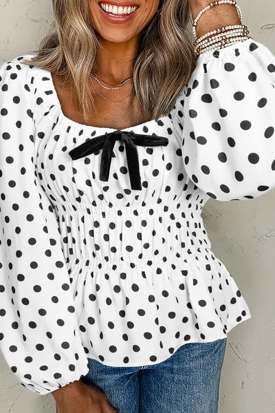 Bow Polka Dot Square Neck Long Sleeve Blouse