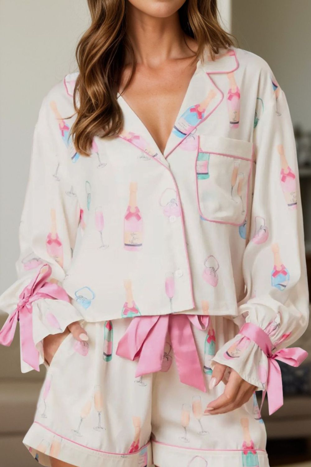 Bow Printed Collared Neck Top and Drawstring Shorts Lounge Set