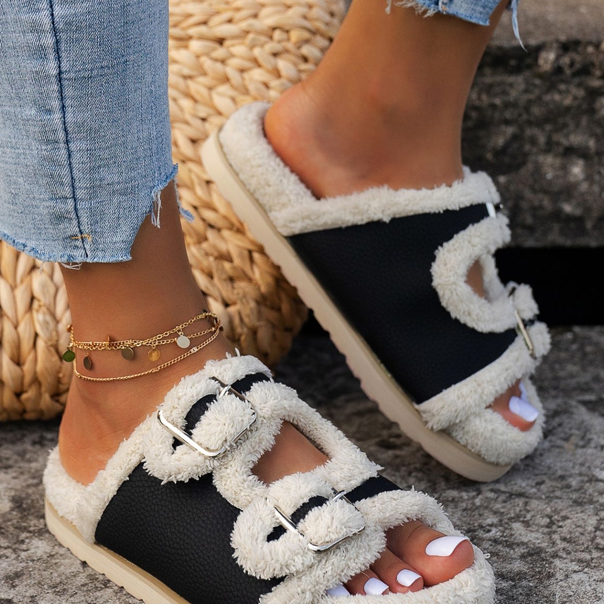 Buckle Decor Plush Lined Platform Slippers