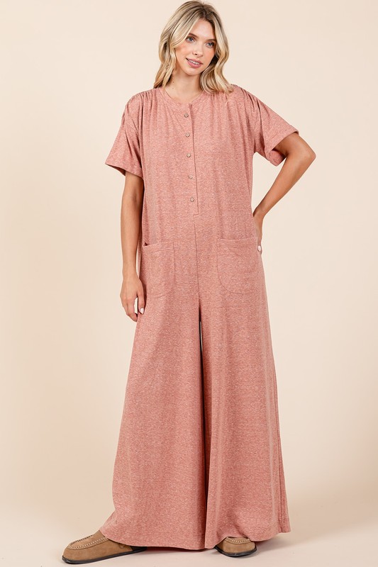 Button Detail Short Sleeve Wide Leg Jumpsuit