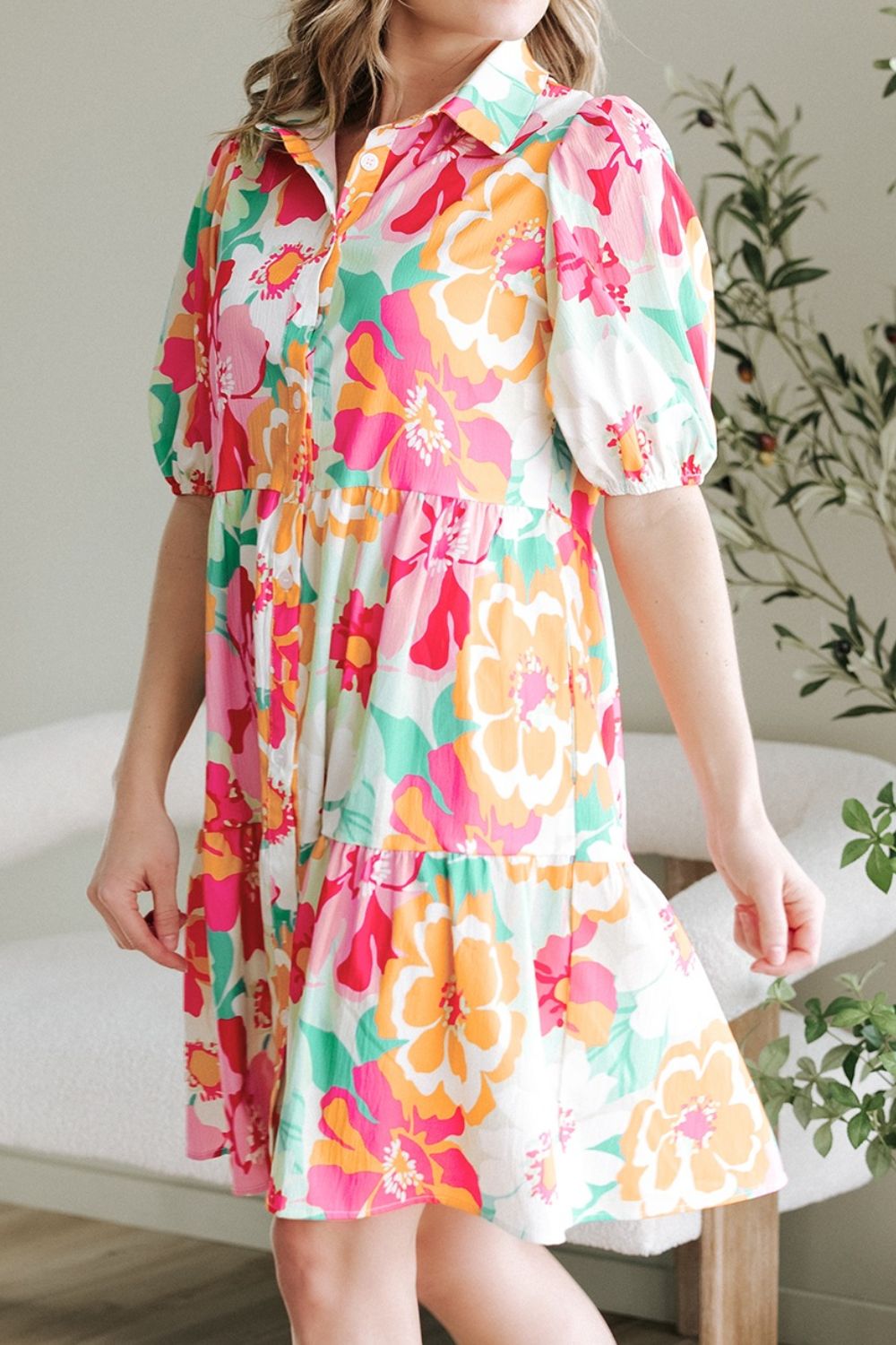 Button Down Floral Puff Sleeve Babydoll Dress