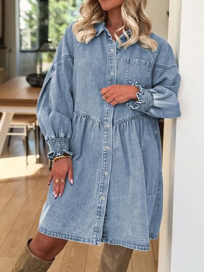 Button-Up Denim Shirt Dress with Smocked Cuffs