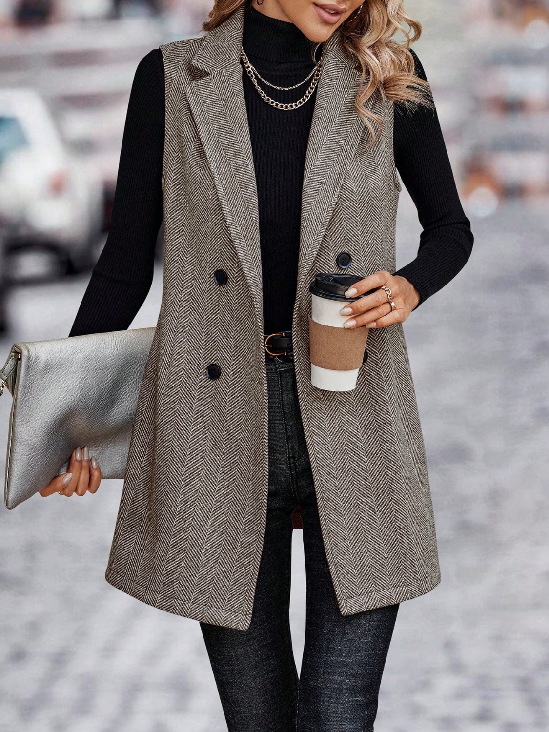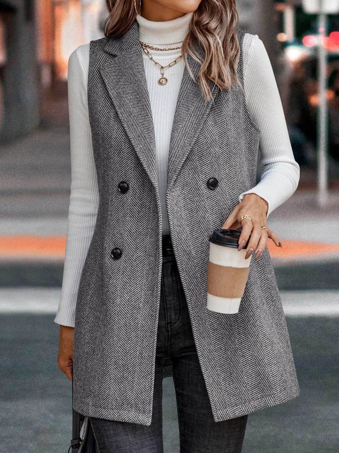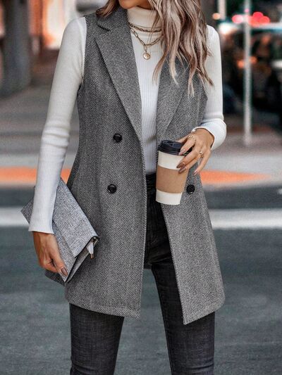 Buttoned Collared Neck Longline Vest Coat