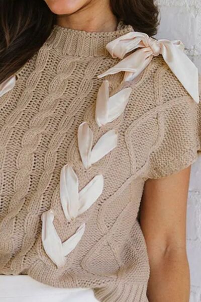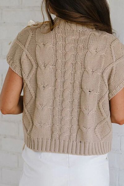 Cable-Knit Tied Mock Neck Short Sleeve Sweater