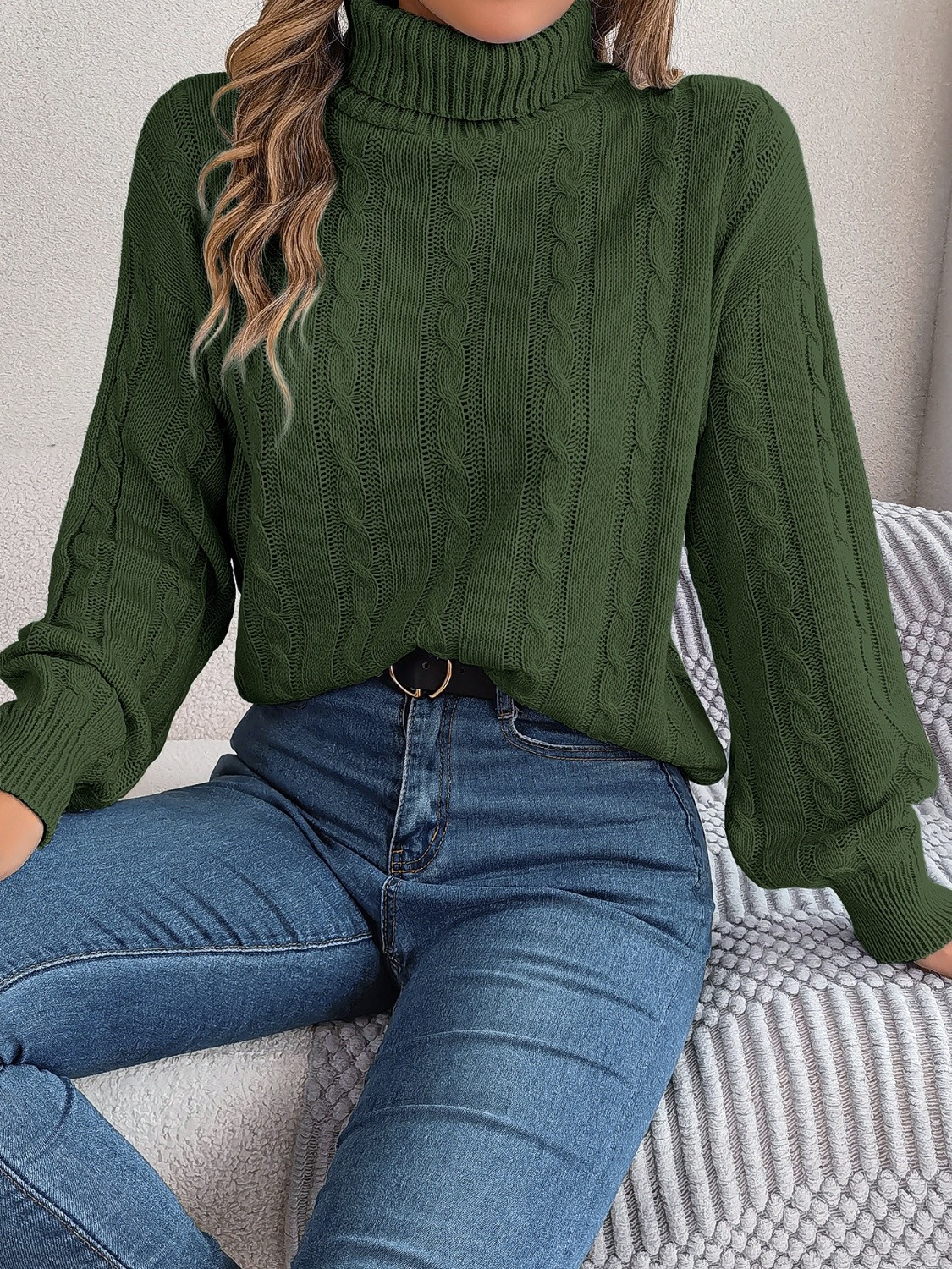 Cable-Knit Turtleneck Dropped Shoulder Sweater