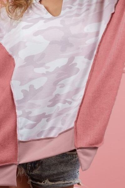 Camo Printed French Terry Knit Color Block Top
