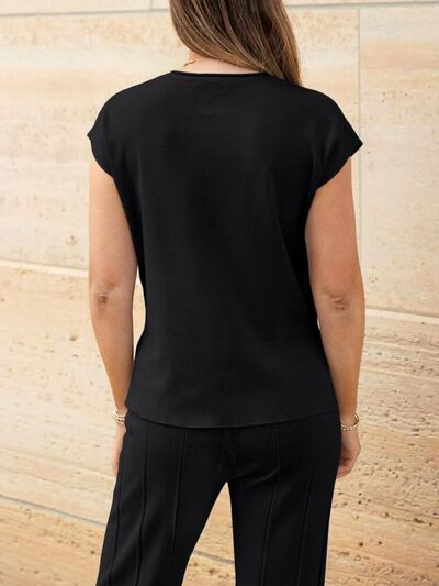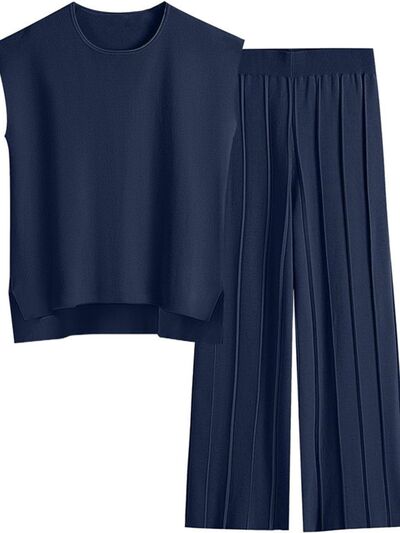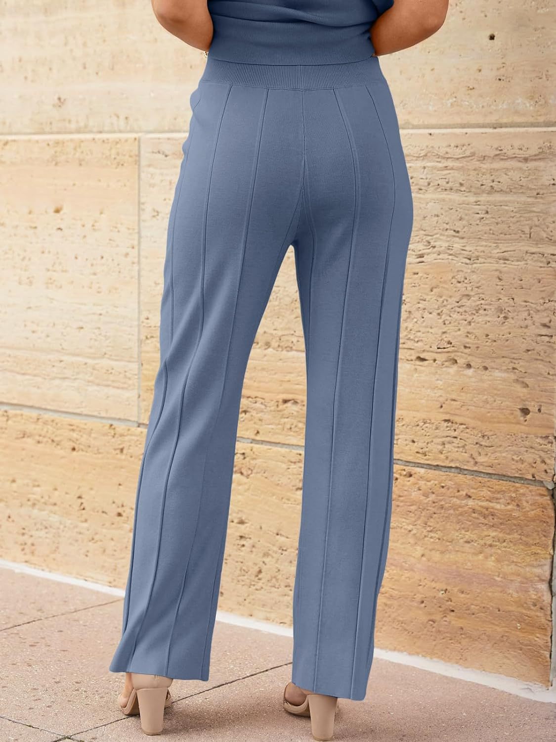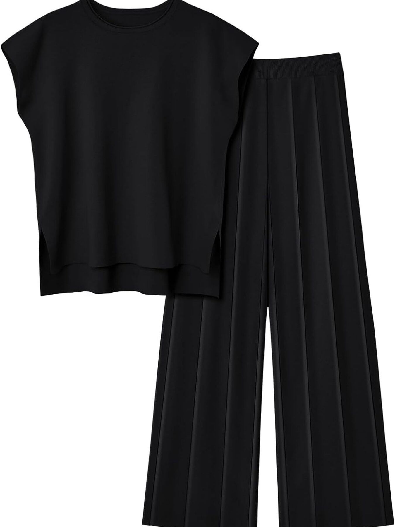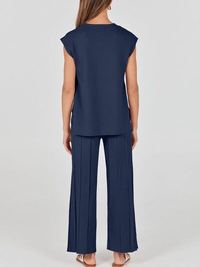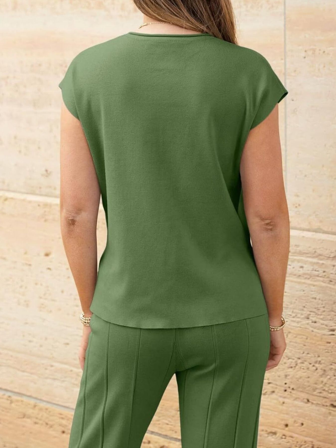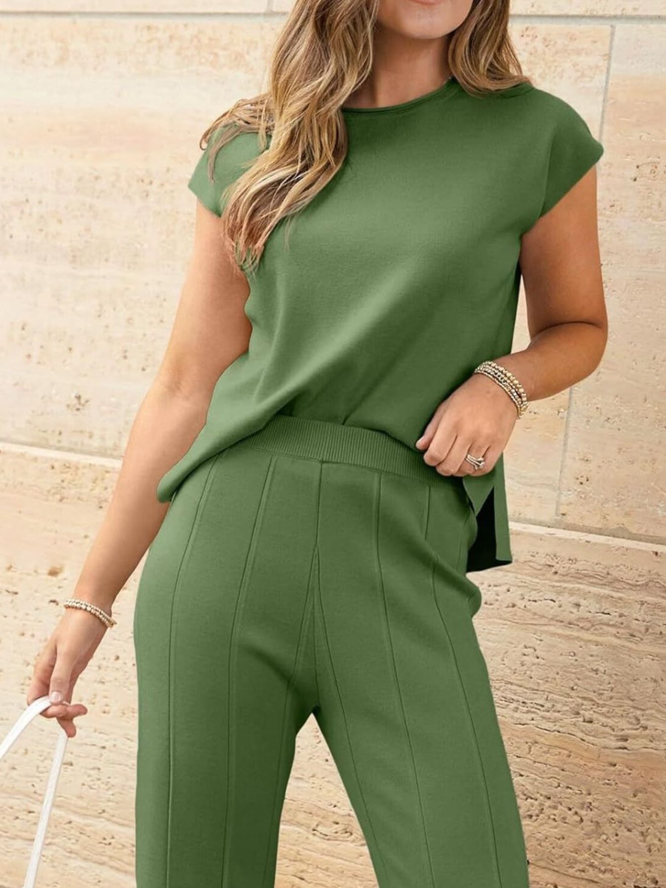 Casual Solid Color Cap Sleeve Top and Pants Knit Set