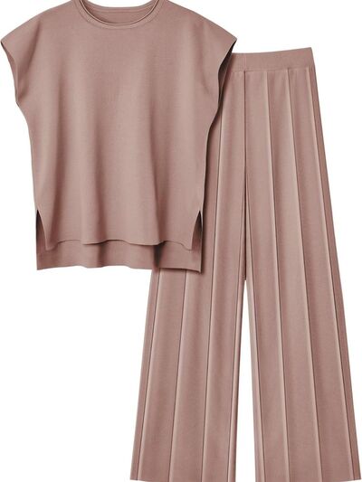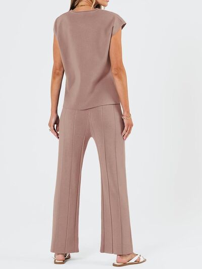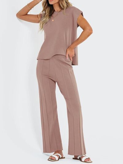 Casual Solid Color Cap Sleeve Top and Pants Knit Set