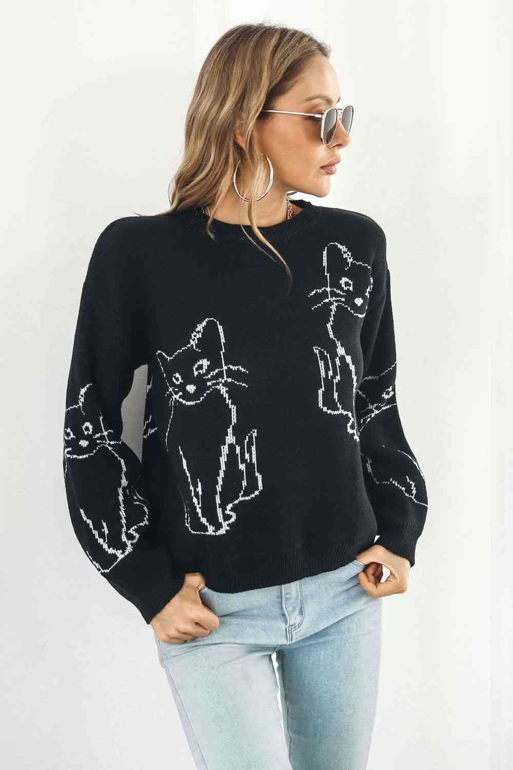 Cat Pattern Round Neck Long Sleeve Pullover Sweater