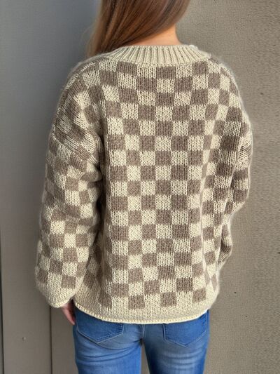 Checkered Button Up Round Neck Cardigan