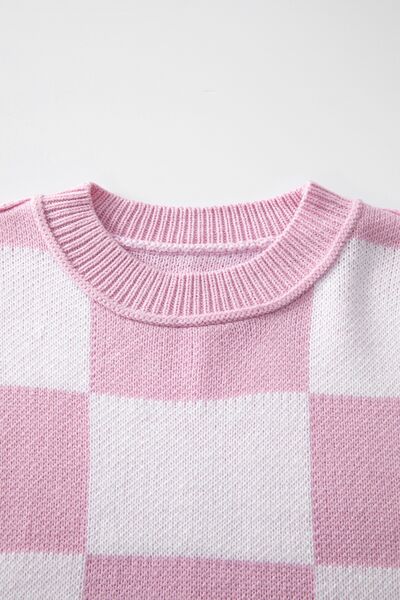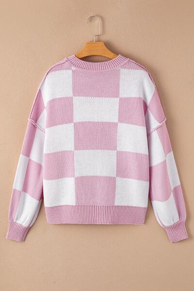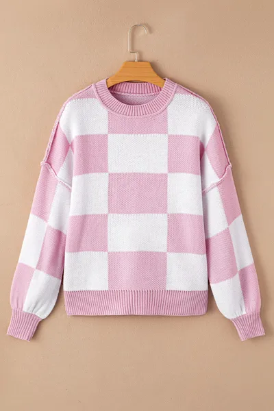 Checkered Exposed Seam Drooped Shoulder Sweater