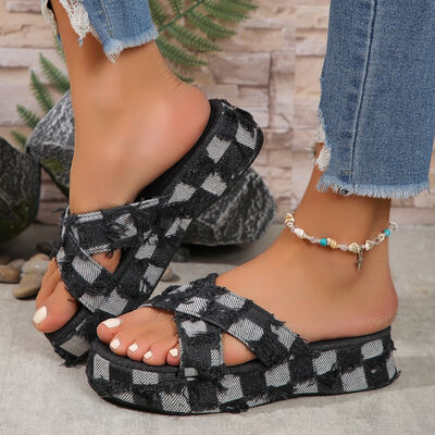 Checkered Raw Hem Open Toe Platform Sandals