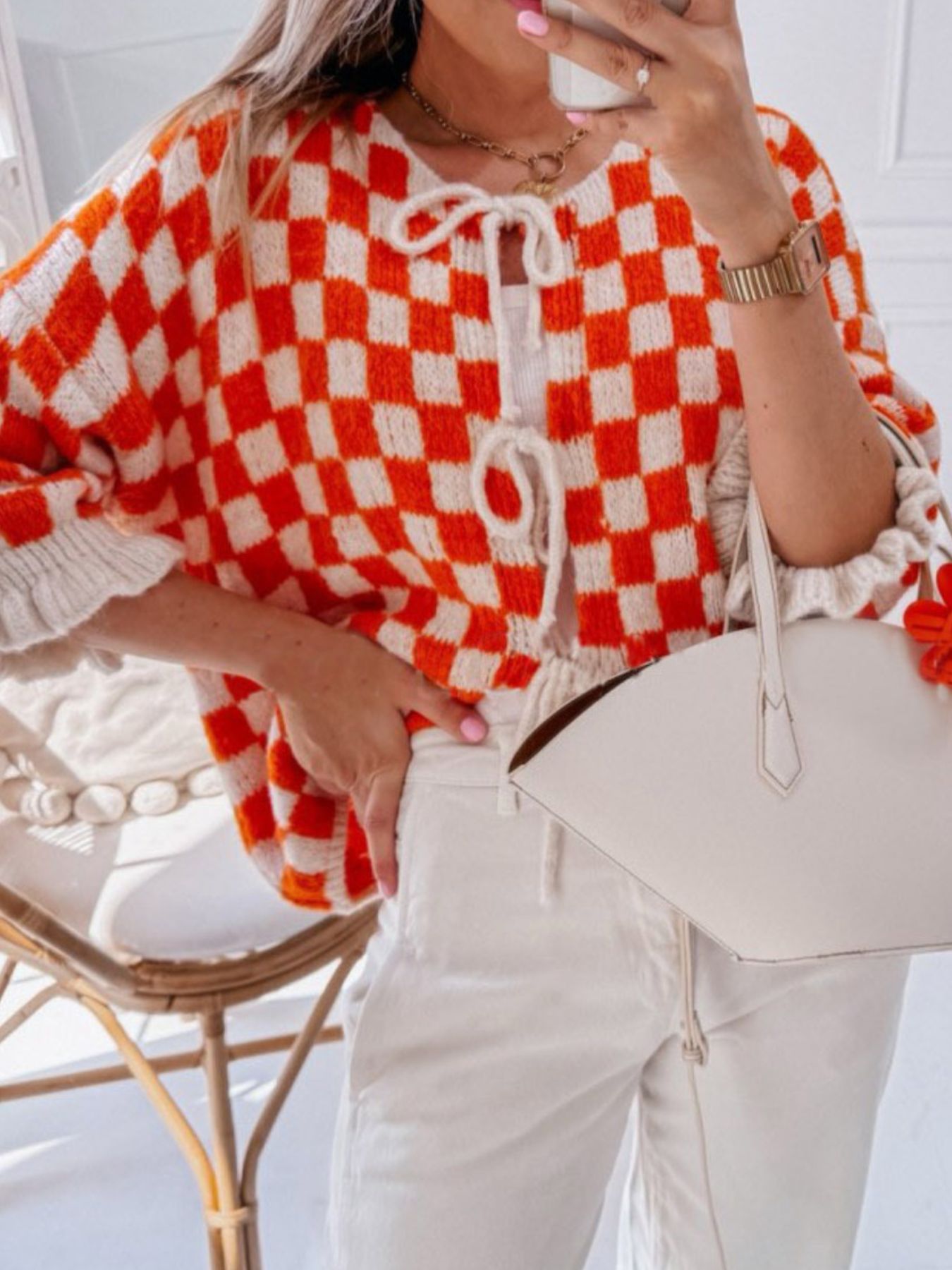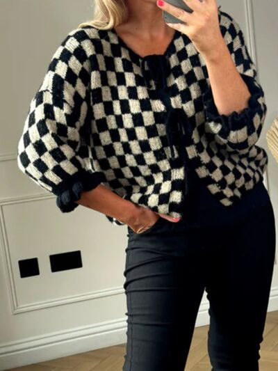 Checkered Tie-Front Knit Cardigan