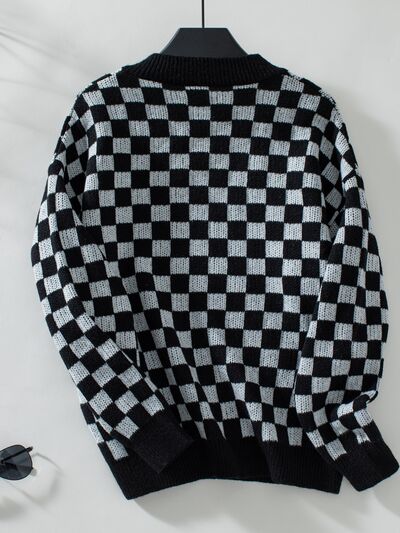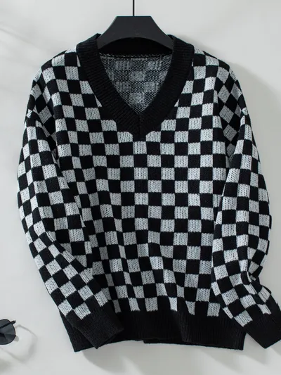 Checkered V-Neck Dropped Shoulder Sweater