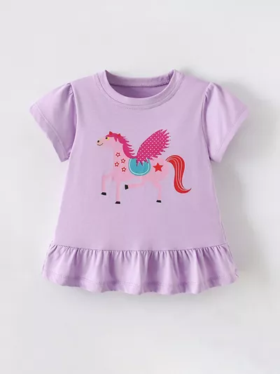 Children's Cute Cartoon Horse Graphic Top with Ruffle Hem