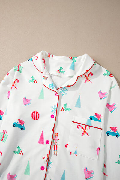Christmas Printed Collared Neck Top and Pants Lounge Set