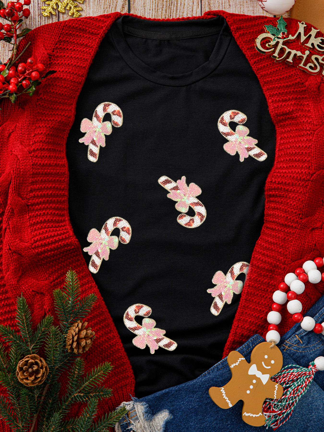 Christmas Sequined Candy Cane Patched Pattern Holiday T Shirt