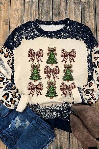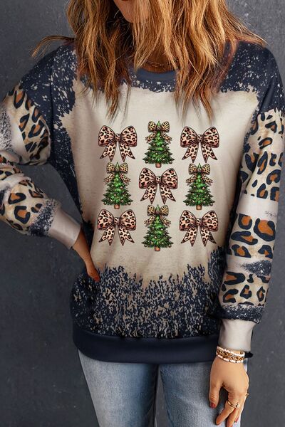 Christmas Tree & Leopard Bow Round Neck Sweatshirt