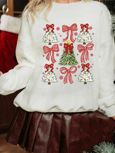 Christmas Tree Ribbon Bow Printed Drop Shoulder Sweatshirt