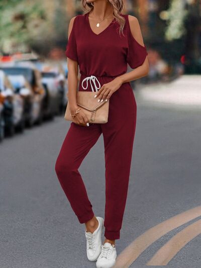 Cold Shoulder V-Neck Drawstring Waist Jumpsuit