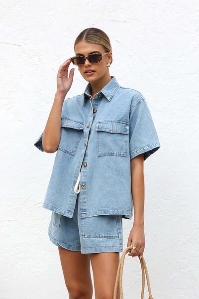 Collared Neck Button Up Top and Shorts Denim Set