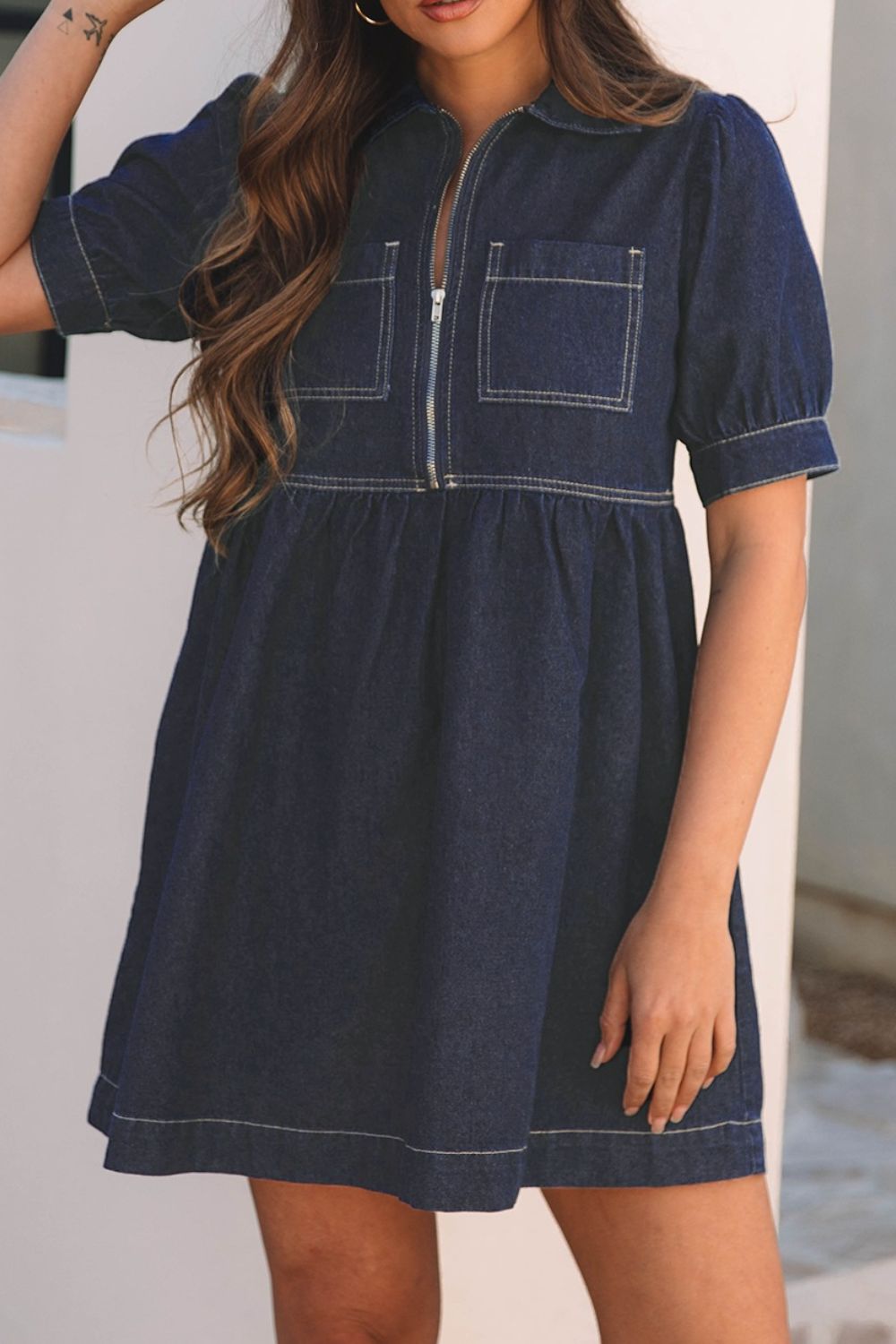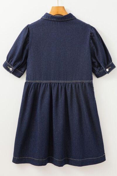 Collared Neck Half Zip Denim Dress