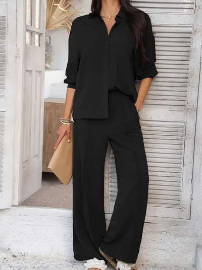 Collared Neck Long Sleeve Top and Pants Set