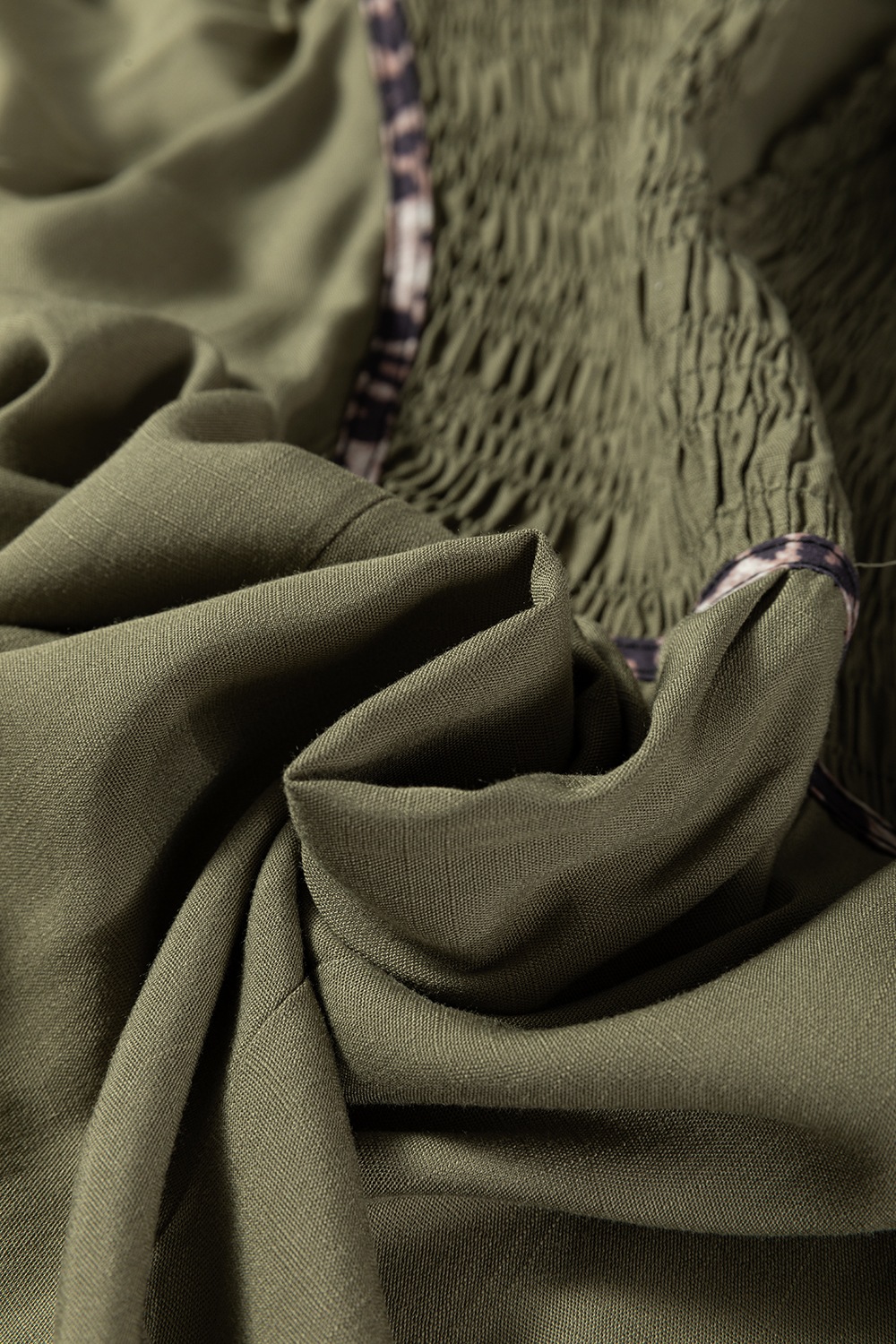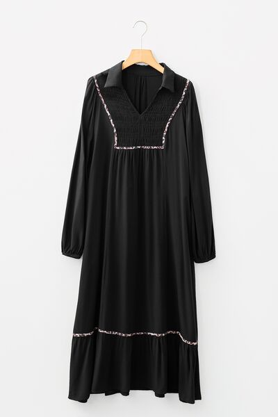 Collared V Neck Smocked Detail Contrast Leopard Trim Dress