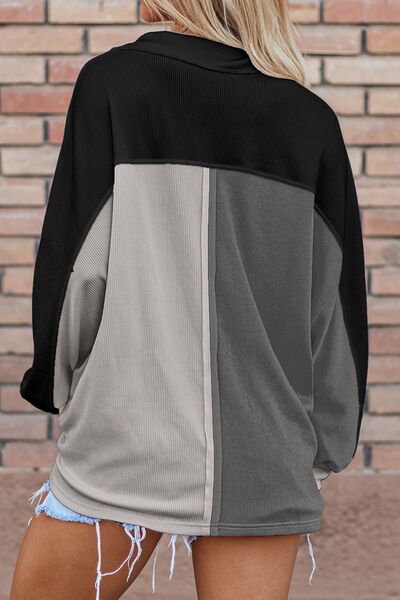 Color Block Collared Neck Long Sleeve Sweatshirt
