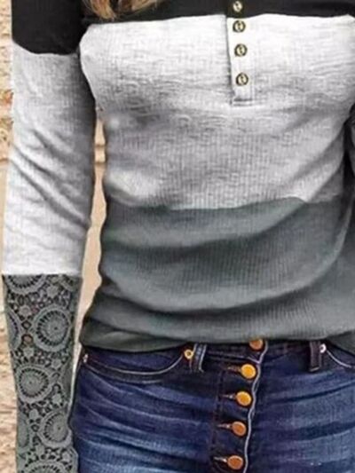 Color Block Lace Detail Half Button T-Shirt