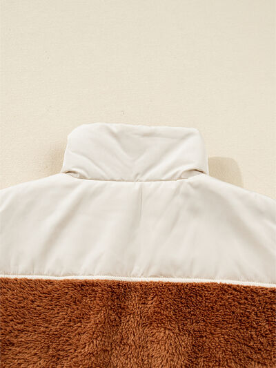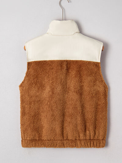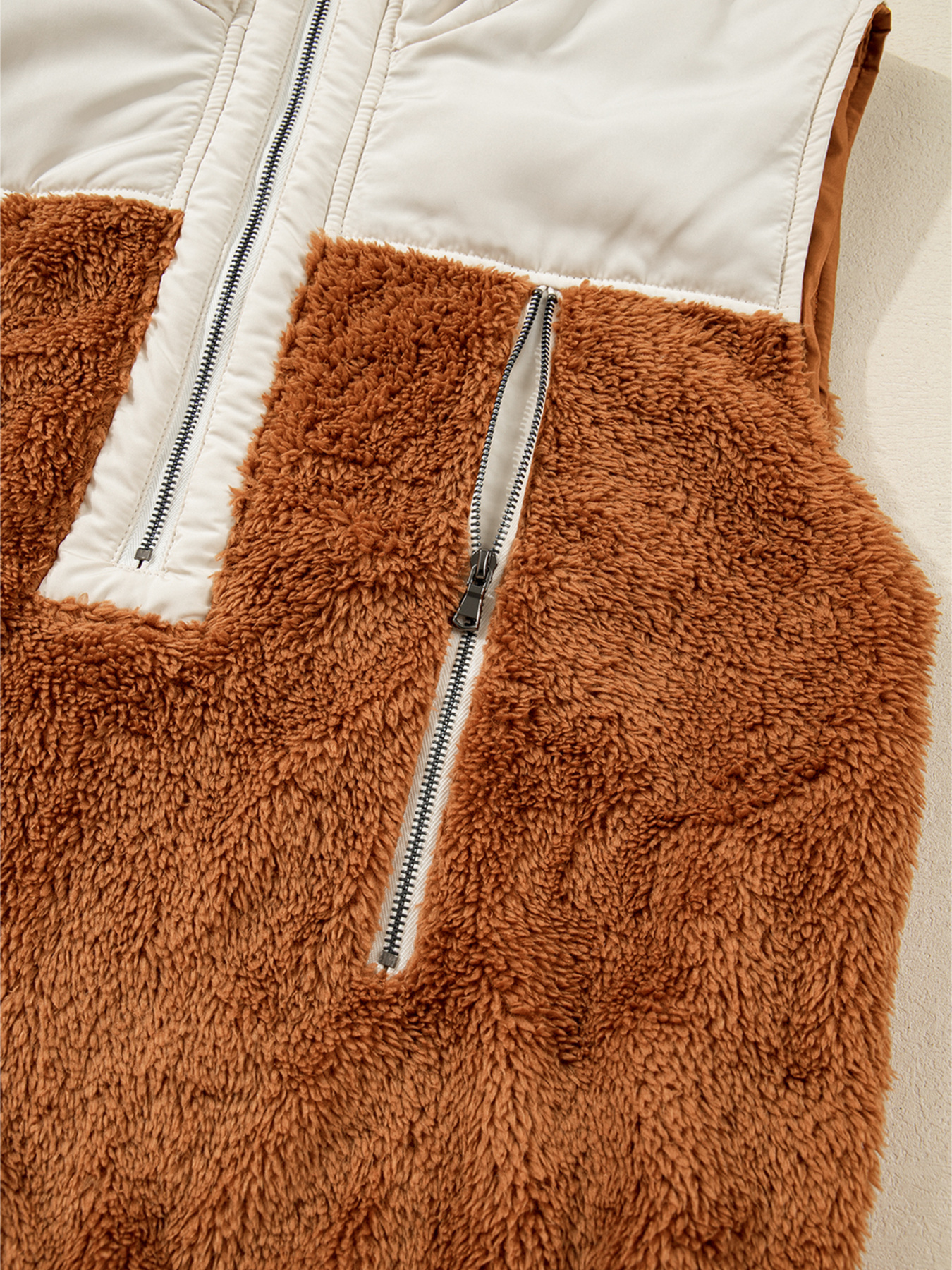 Color Block Plush Patchwork Zipper Stand Neck Vest Coat