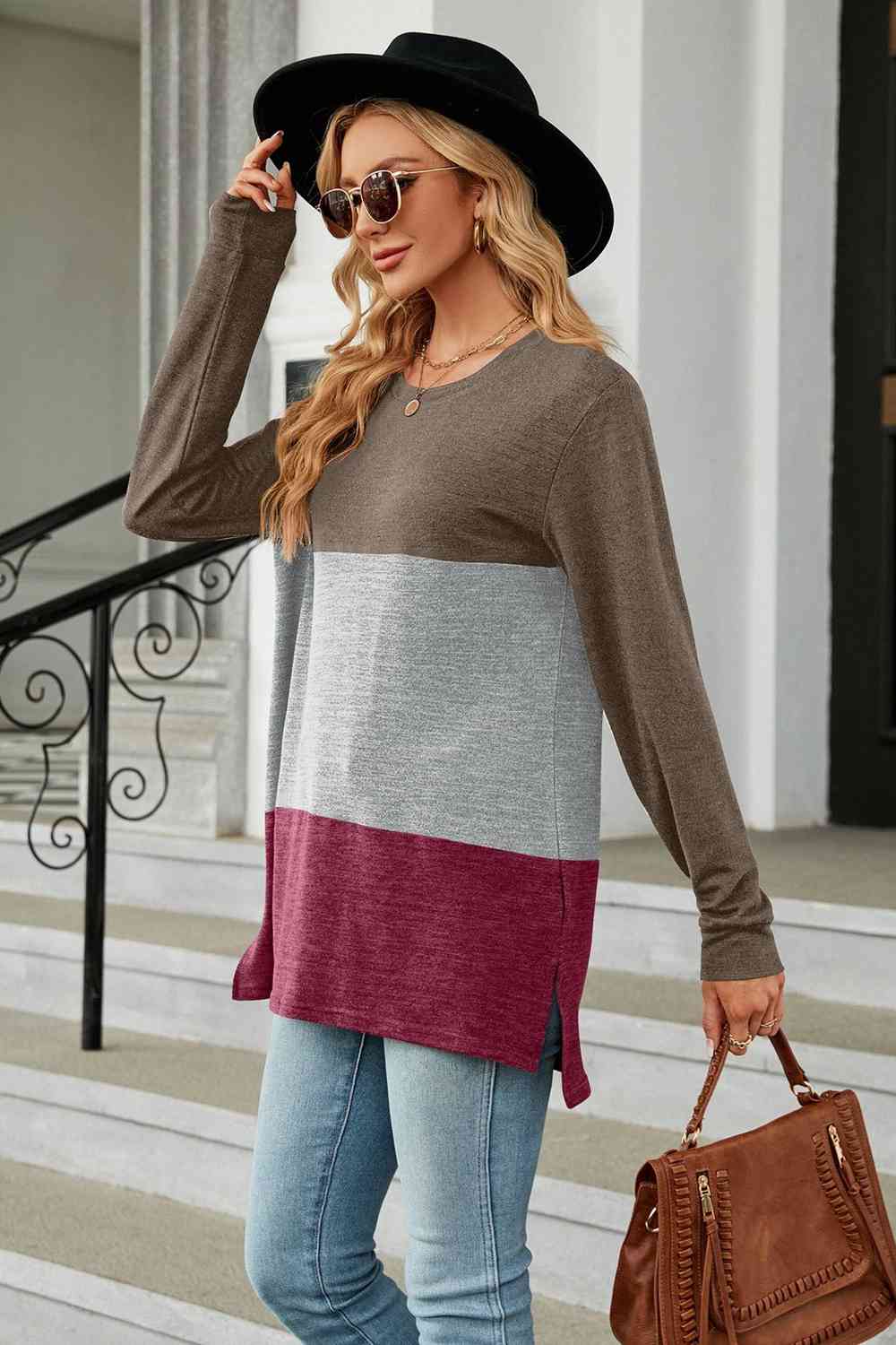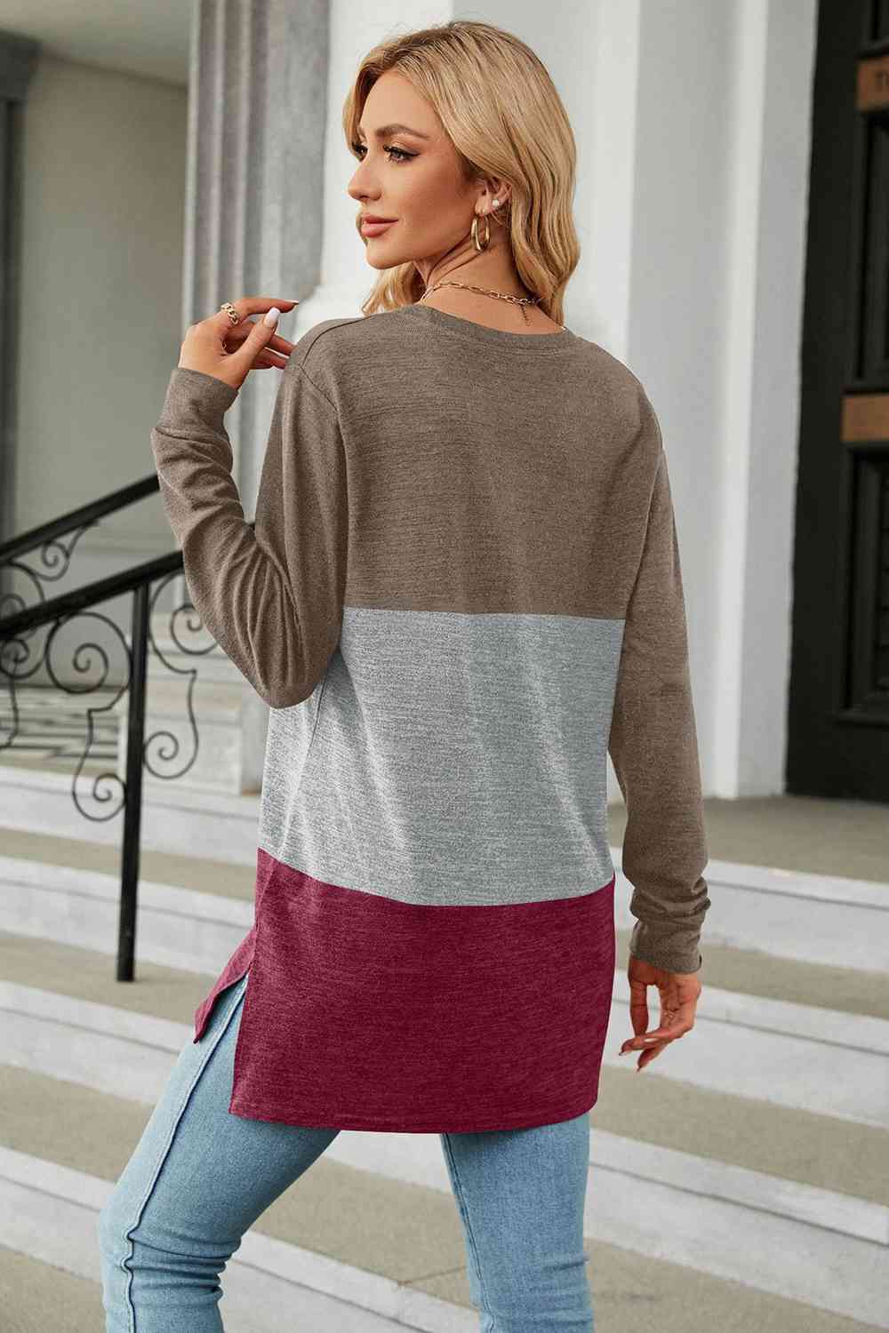 Color Block Round Neck Long Sleeve Slit T-Shirt