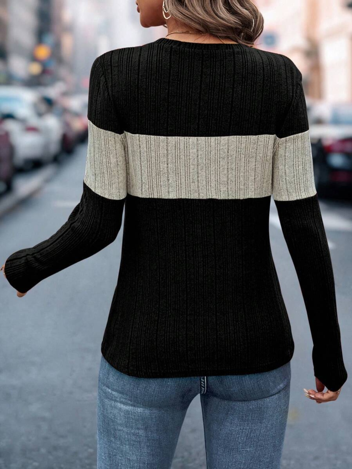 Color Block Round Neck Long Sleeve Top