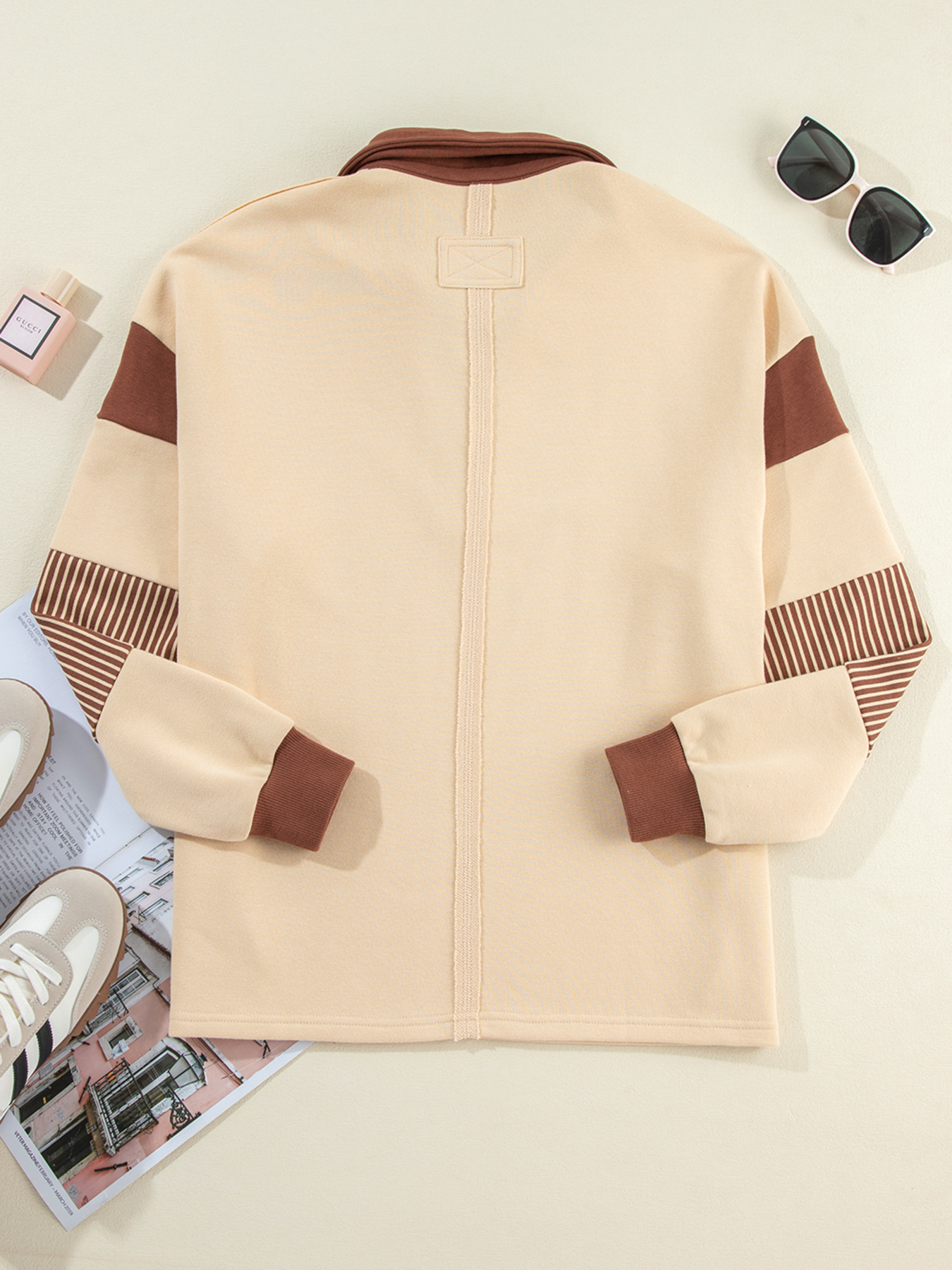Color Block Striped Patchwork Sequin Rugby Graphic Polo Sweatshirt