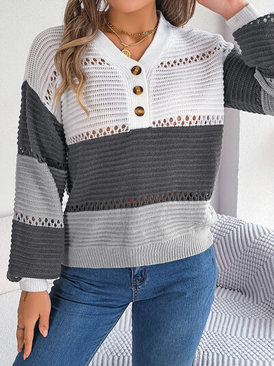 Color Block Striped V-Neck Button Detail Sweater