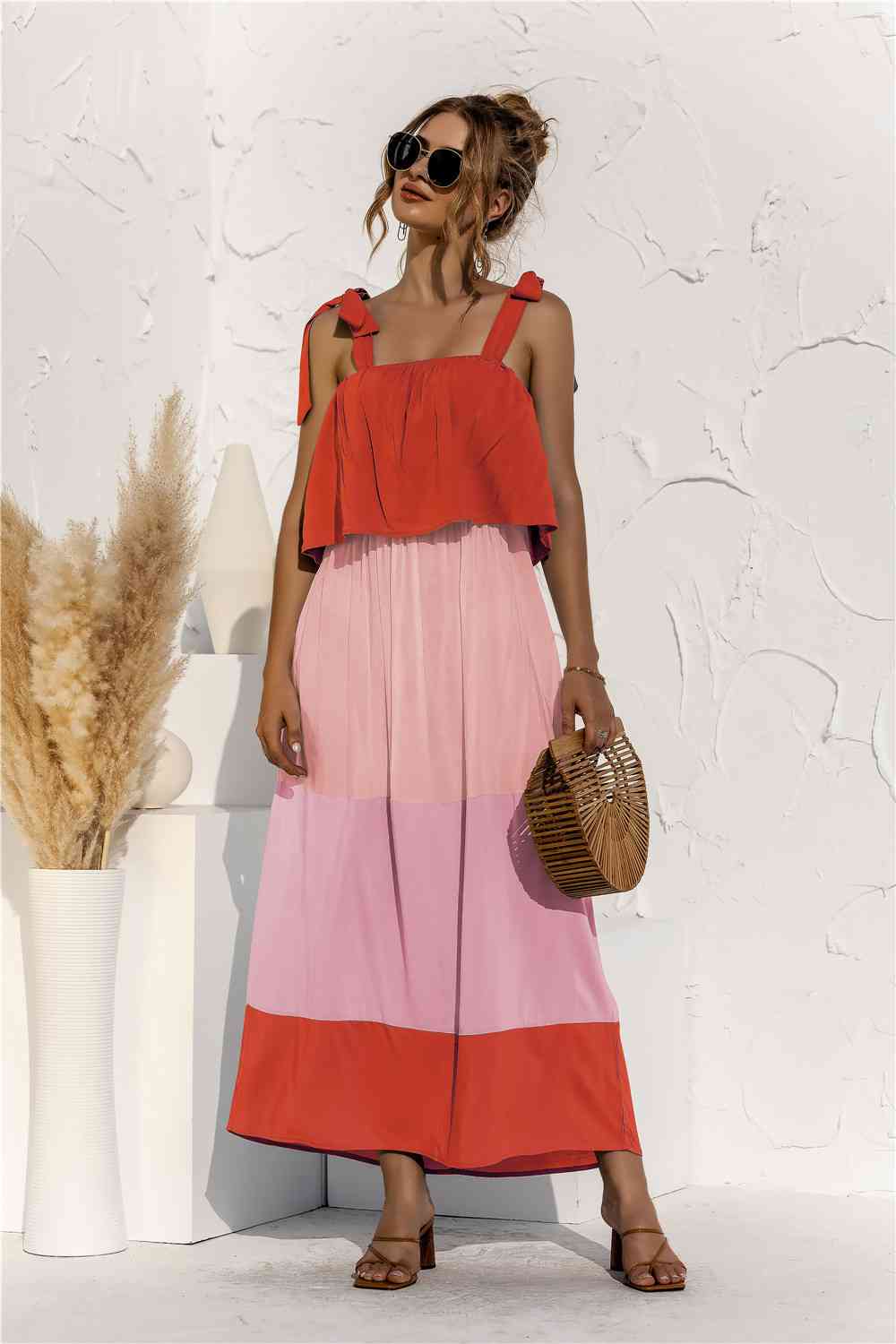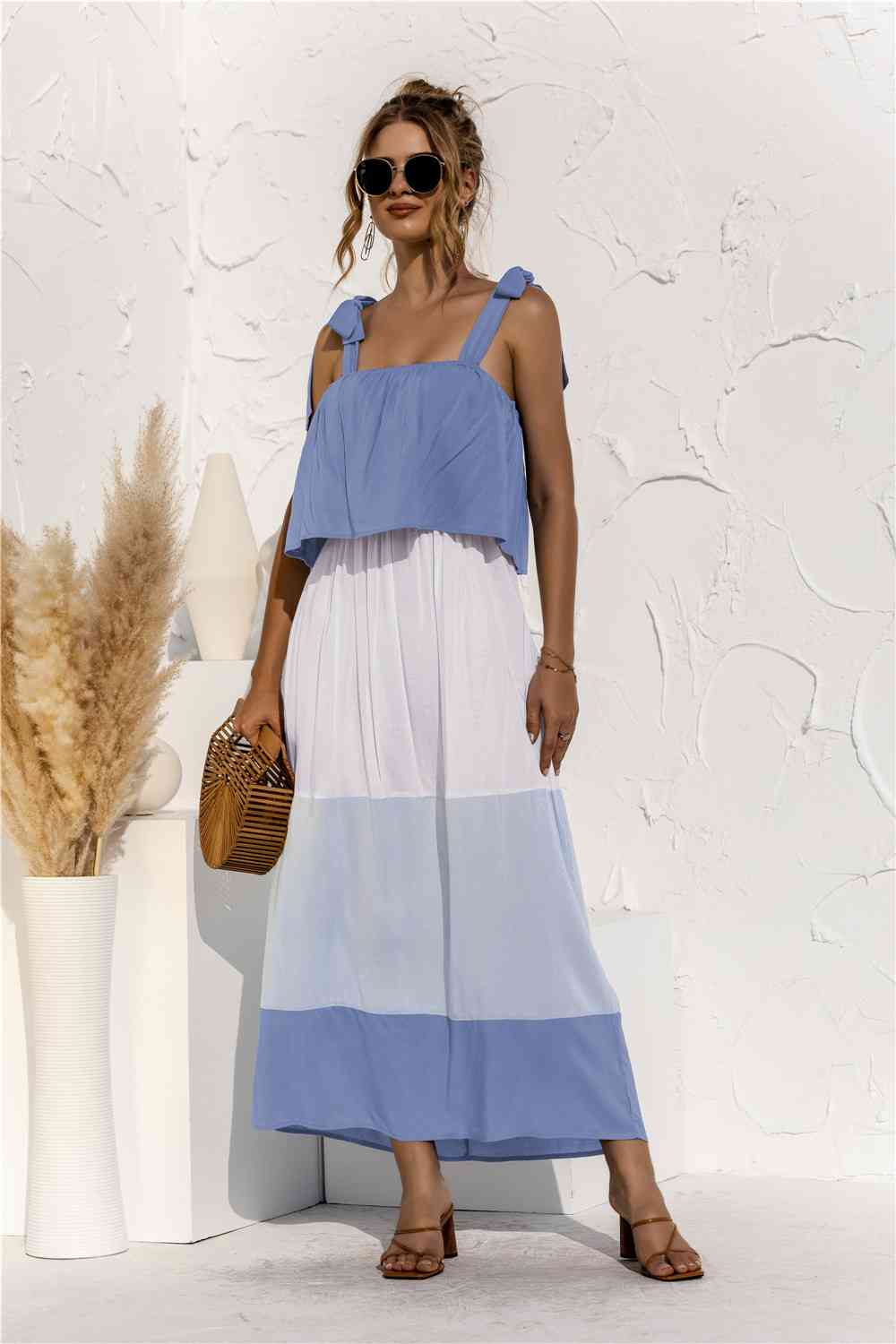 Color Block Tie Shoulder Tiered Sleeveless Dress