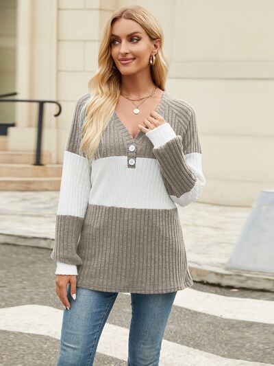 Color Block V-Neck Long Sleeve T-Shirt