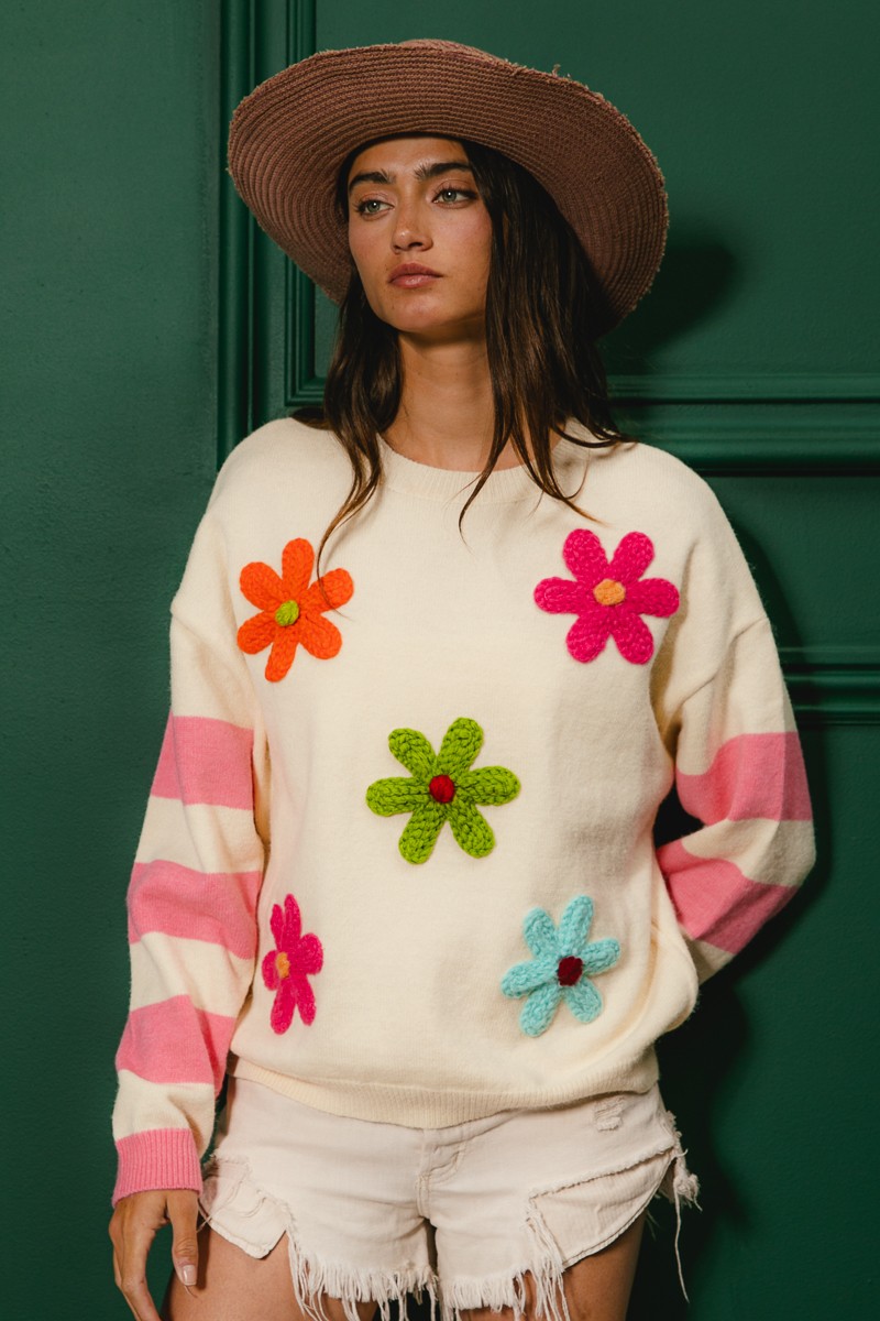 Colorful Floral Patched Sweater with Striped Sleeve