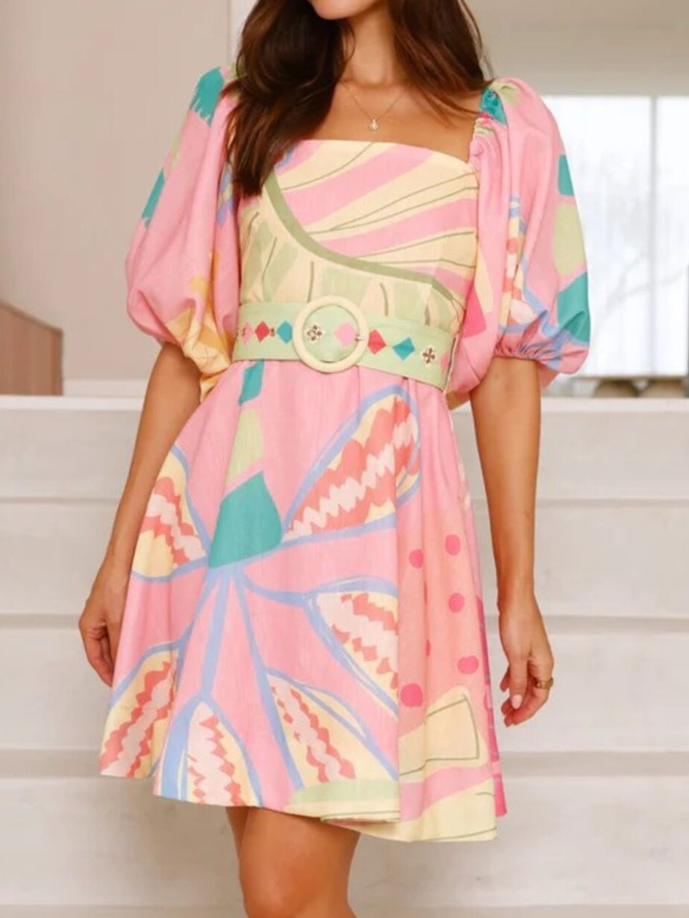 Colorful Print Belted Mini Dress with Puff Sleeves