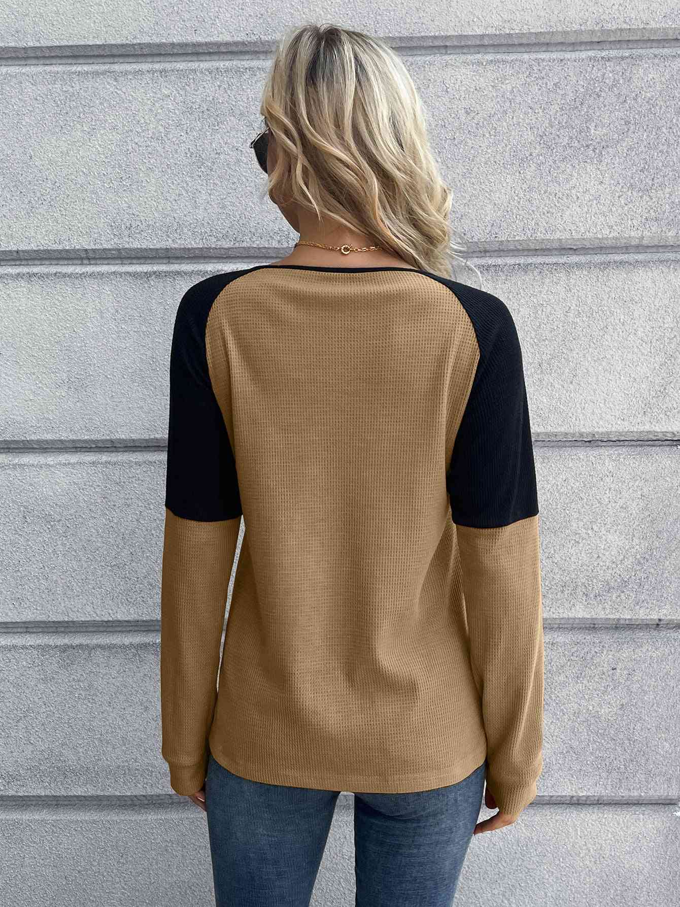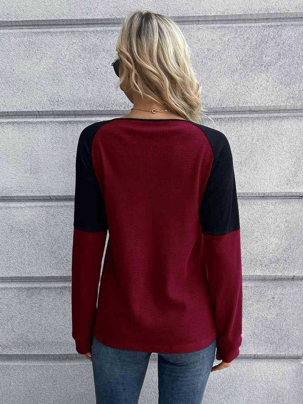 Contrast Buttoned Round Neck Raglan Sleeve Top