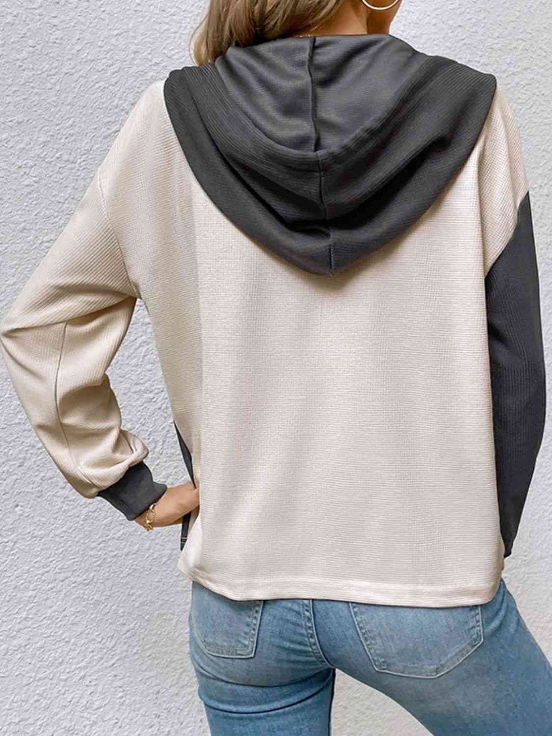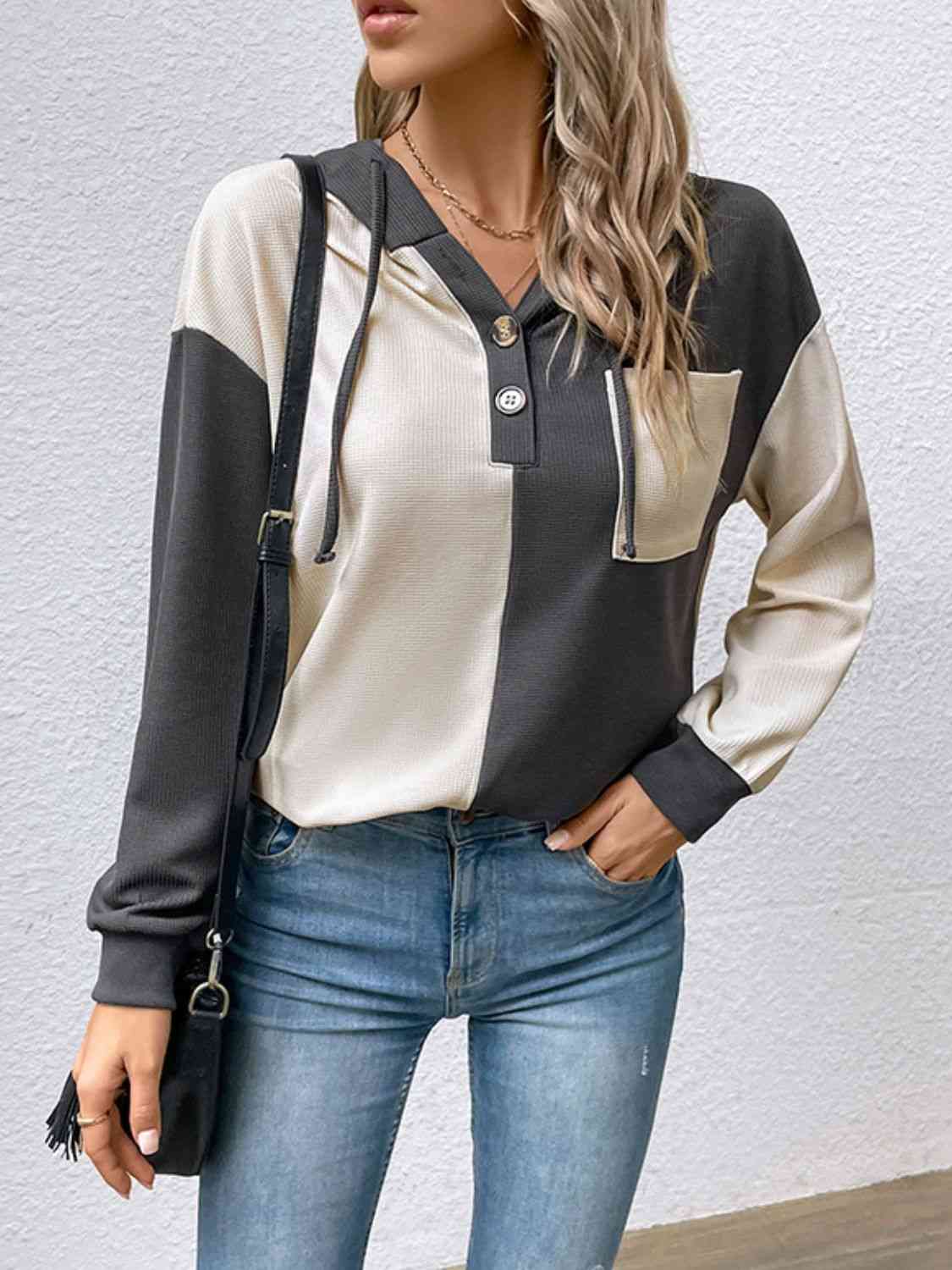 Contrast Color Button-Up Raglan Sleeve Hoodie