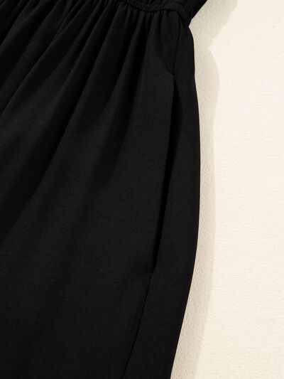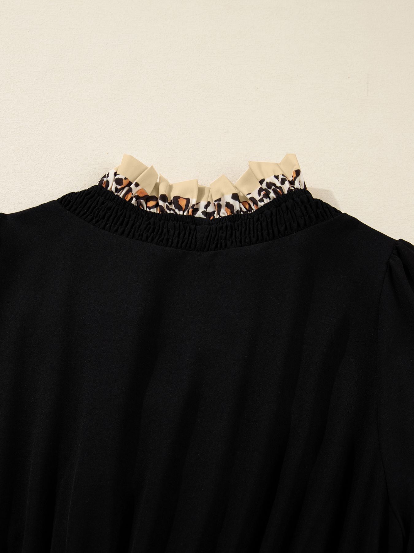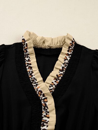 Contrast Leopard Frilled Trim V Neck Bracelet Sleeve Midi Dress