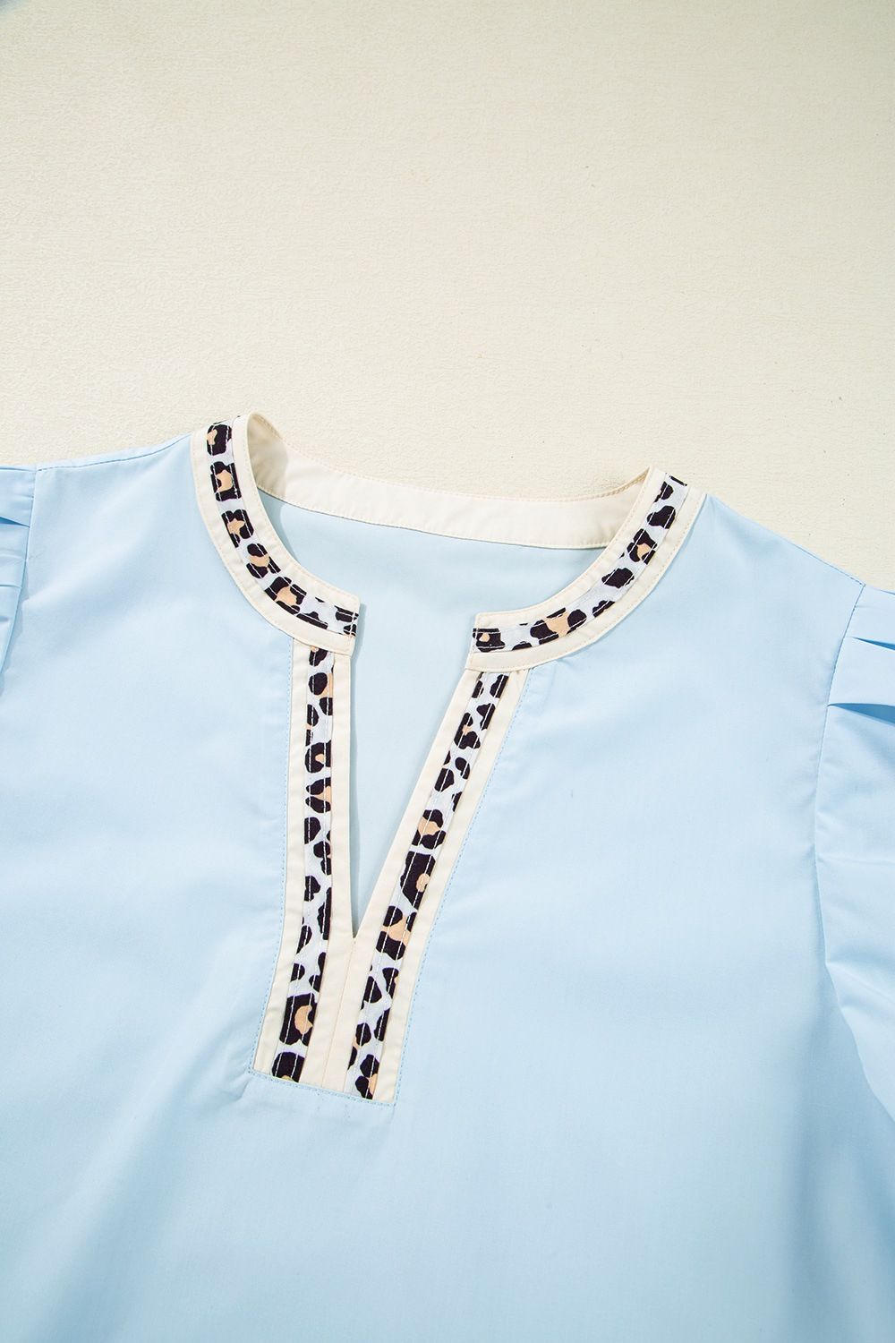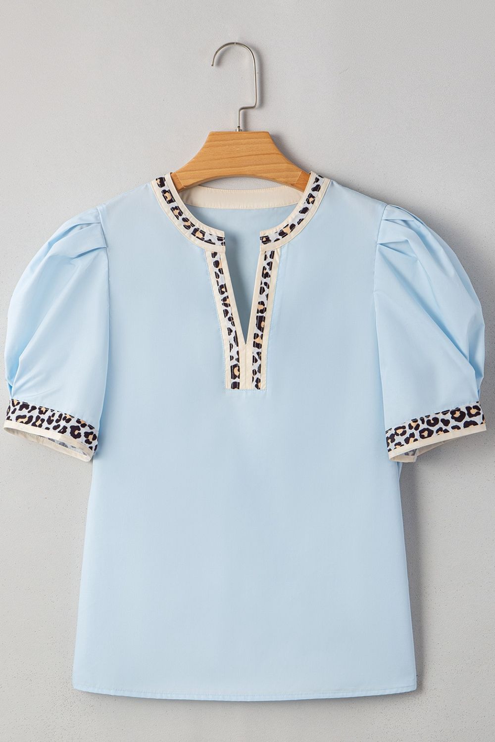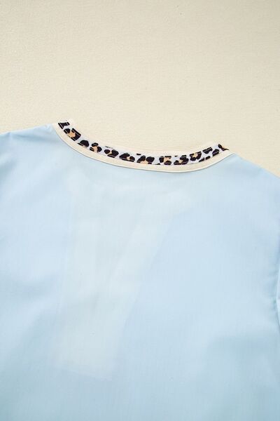 Contrast Leopard Trim Split Neck Puff Sleeve Blouse