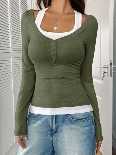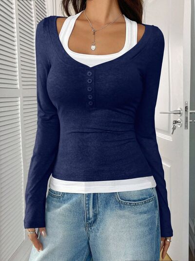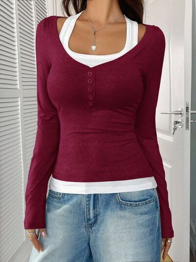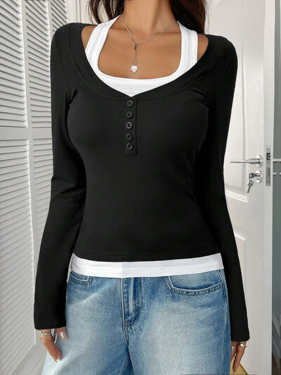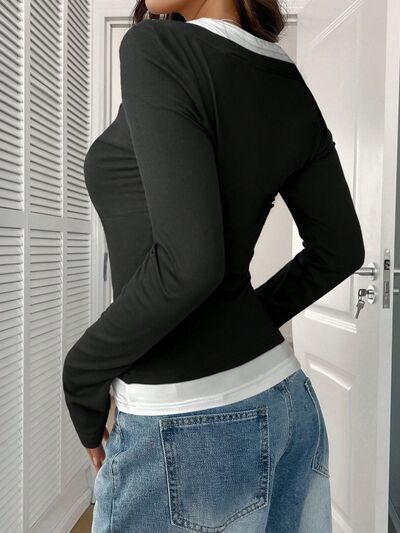 Contrast Long Sleeve Fake Two-Piece T-Shirt