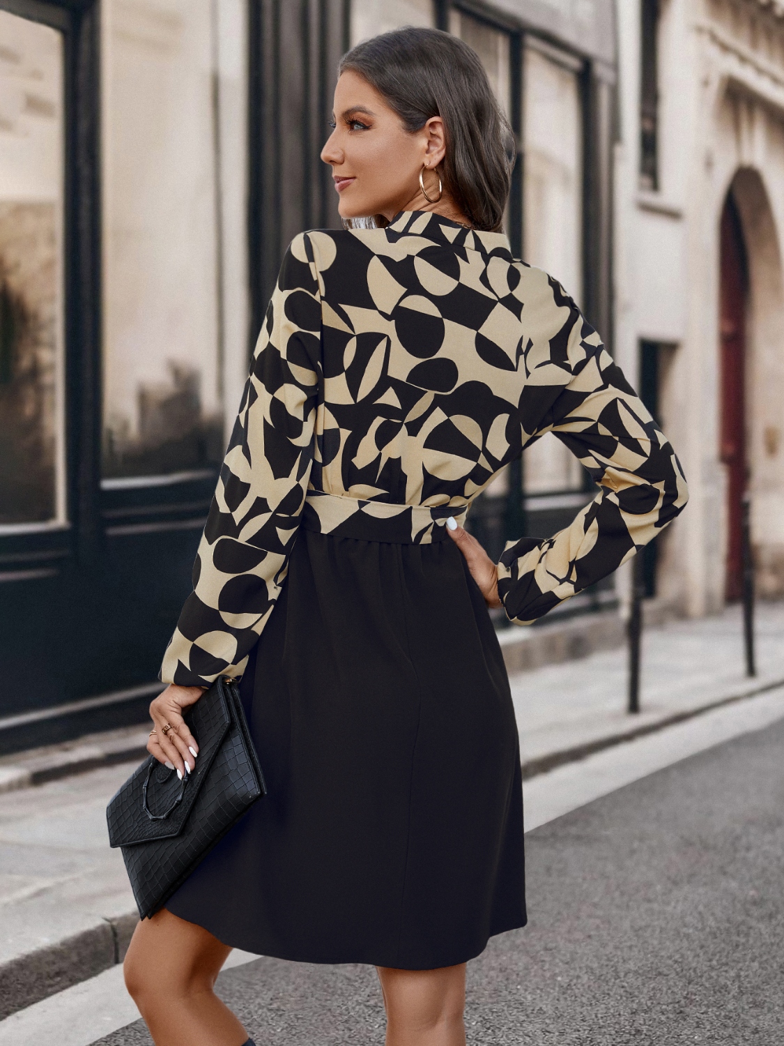 Contrast Notched Tie Front Long Sleeve Dress