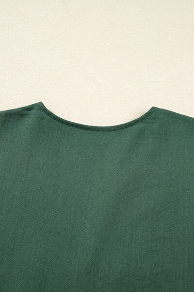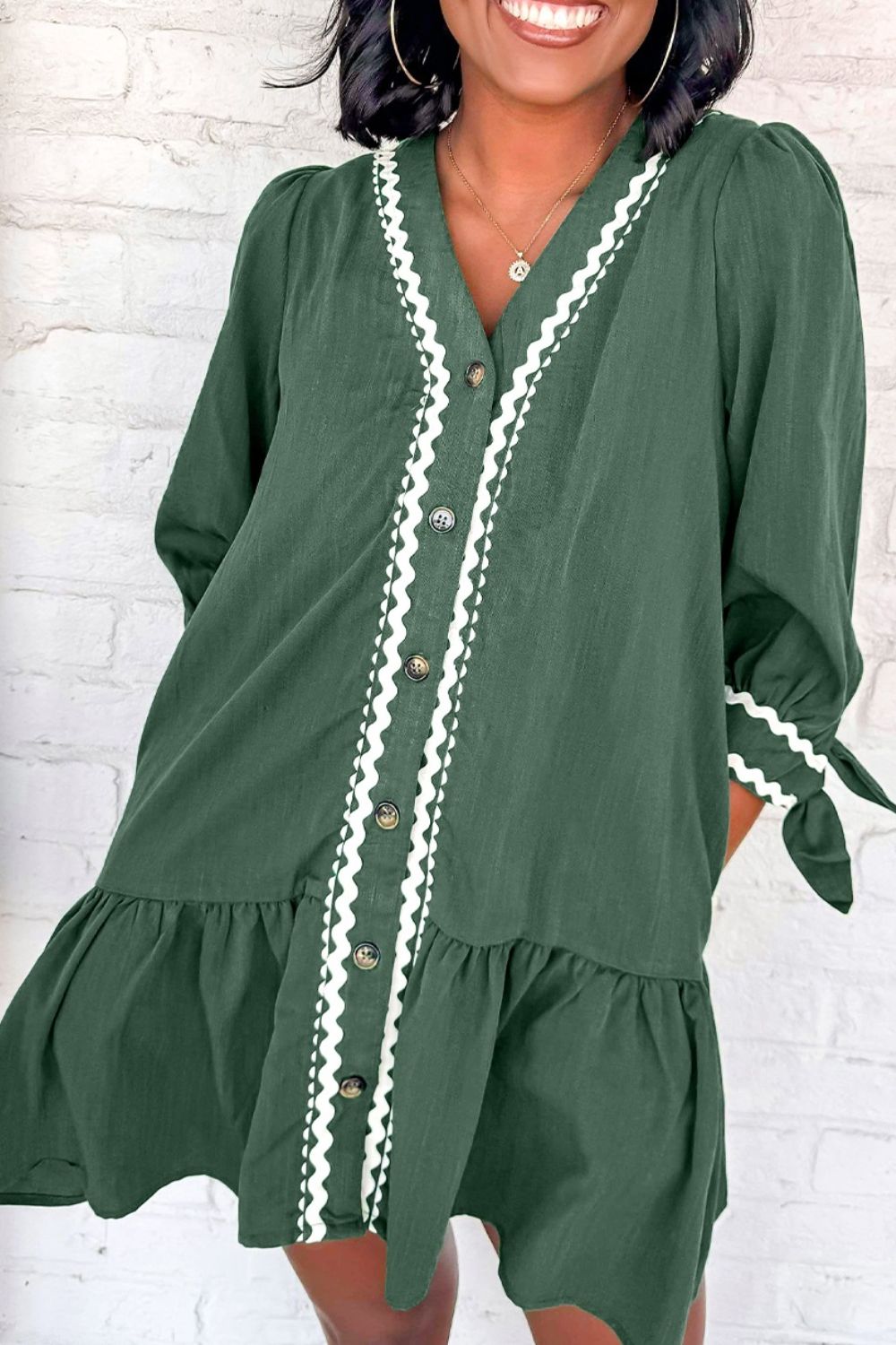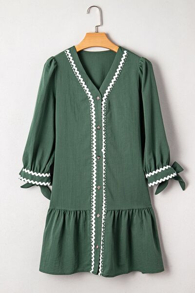 Contrast Ricrac Trim Button V Neck Knotted Bracelet Sleeve Shift Dress