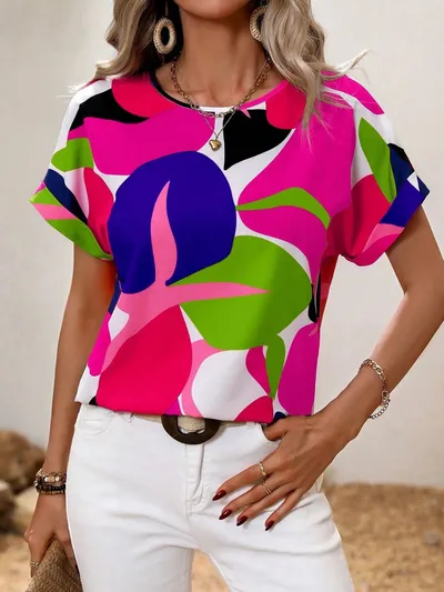 Contrast Round Neck Short Sleeve Blouse